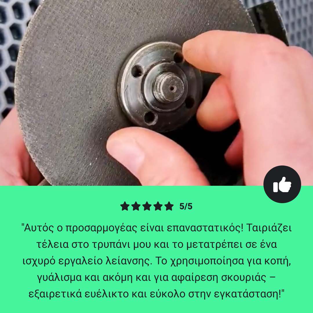 Είναι ένα αρκετά απλό εργαλείο. Μπορείτε να το χρησιμοποιήσετε για να προσαρμόσετε όλους τους λειαντικούς δίσκους γωνιακού τροχού για χρήση σε φορητό τρυπάνι. Ο προσαρμογέας είναι στιβαρής ποιότητας και αντέχει εύκολα στη φθορά. Ο αντάπτορας συνοδεύεται από αναλυτικές οδηγίες και περιλαμβάνει τα κατάλληλα κλειδιά για γρήγορο σφίξιμο ή αλλαγή του λειαντικού.