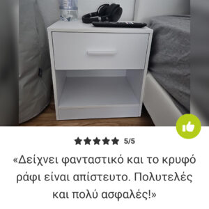 - Κομψός Χώρος – Το κύριο συρτάρι και το ανοιχτό ράφι προσφέρουν χώρο για βιβλία, γυαλιά και άλλα καθημερινά αντικείμενα.