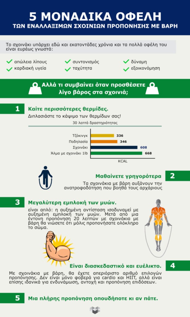 • Το σχοικάνι με βάρη είναι βαρύτερο από το κανονικό σχοινάκι, σας βοηθάει να καταναλώσετε περισσότερη ενέργεια και να χτίσετε τους μύες σας.